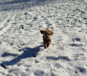 Geschneit hat es inzwischen auch. Da bekommen wir beim Spazieren gehen immer ganz kalte Pfötchen. Und mein Ball versinkt beim Spielen auf der Wiese im Schnee. Dann muss ich immer die halbe Wiese abschnuppeln damit ich ihn wiederfinde. Aber viel ist vom Schnee jetzt sowieso nicht mehr übrig.