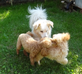 Wir spielen viel zusammen. Abends gehn wir meistens noch zusammen mit Herrchen, Frauchen und Askan auf die große Wiese. Herrchen spielt dann mit mir Ball und Frauchen übt mit Ludwig die Grundkommandos. Er stellt sich dabei ganz gut an, für Futter macht er fast alles. Und Askan guckt einfach zu.